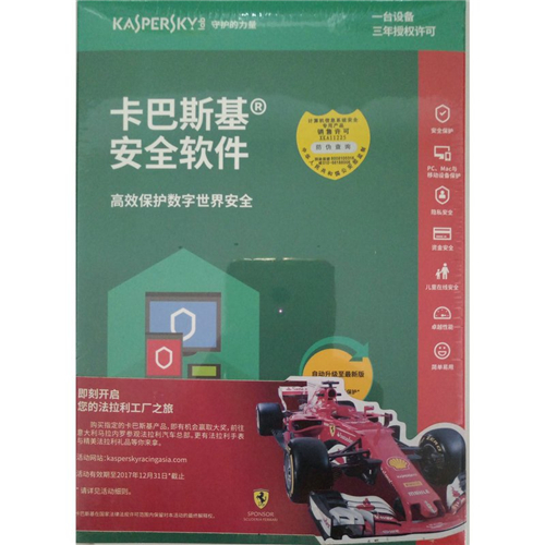 卡巴斯基(kaspersky)安全软件 2018年版 适用于1台电脑3年防护期 光盘盒装版
