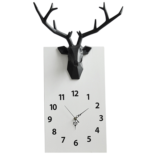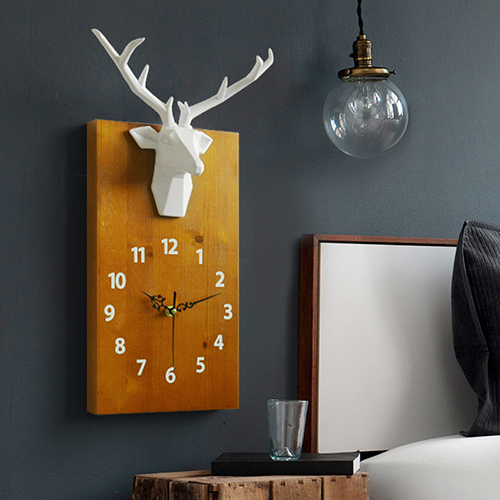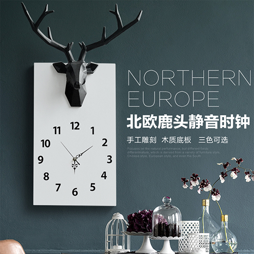 鹿头挂钟北欧简约创意静音时钟客厅卧室墙面装饰挂表实木壁挂钟表