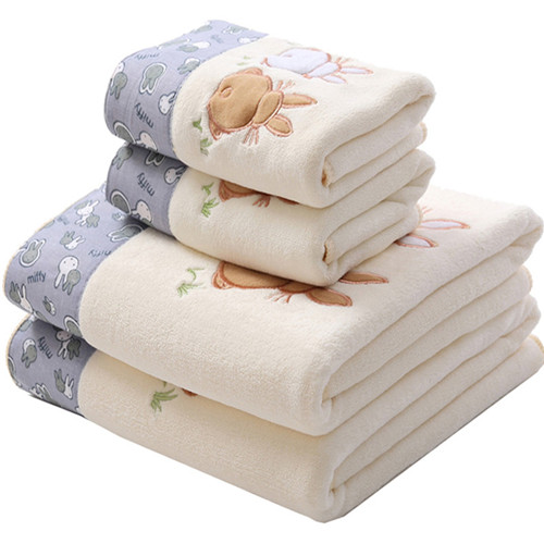 浴巾超强吸水纯棉全棉柔软成人男女洗脸家用速干毛巾两件套 米白萌兔套装 70*140cm